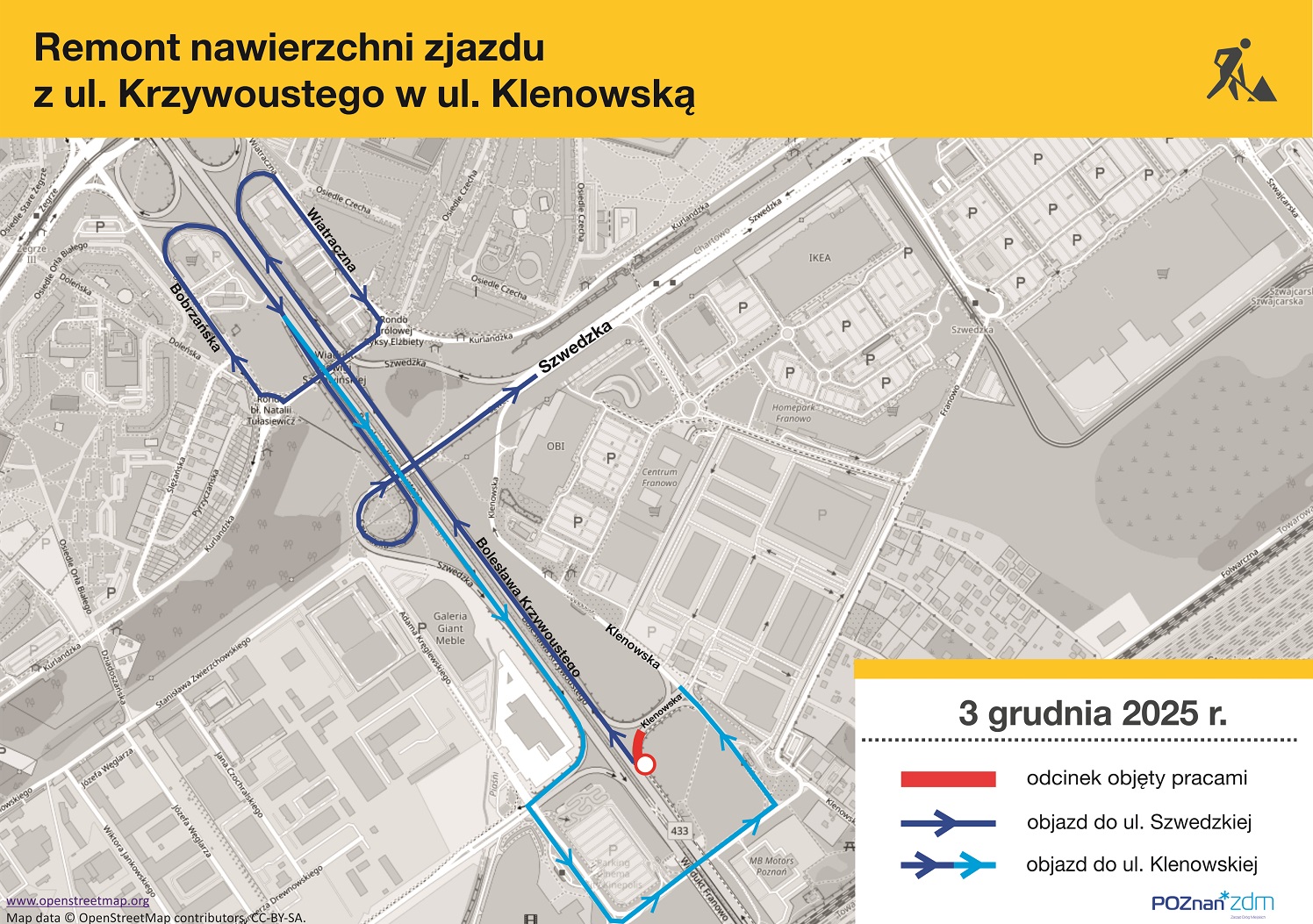 Złe wieści dla mieszkańców podpoznańskich sypialni oraz klientów planujących zakupy w rejonie Franowa (IKEA, OBI, Centrum Handlowe M1). Zarząd Dróg Miejskich zapowiedział pilny remont nawierzchni zjazdu z ul. Bolesława Krzywoustego w ul. Klenowską.